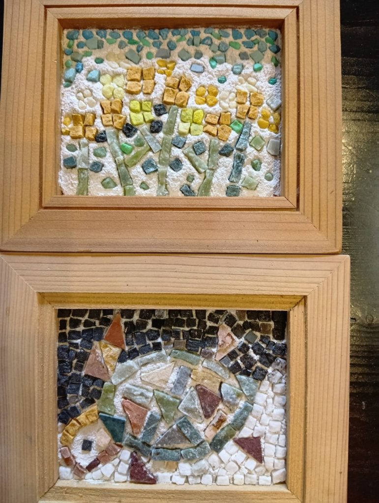 好きな石のテッセラ(ピース・かけら)を選んで小さな額に思い思いの模様を自由に作ってみましょう!アトリエひとつのポストカードも少しだけお持ちします。